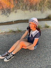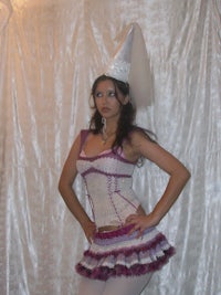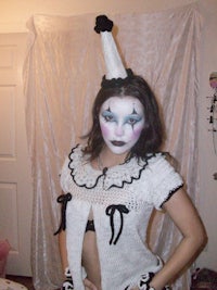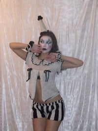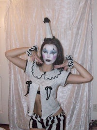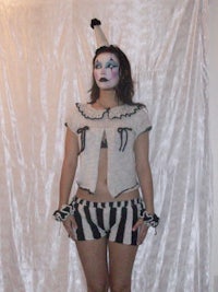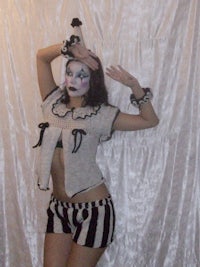 pieces : collared top (1), striped shorts (2), ruffle wrist cuffs (3), clown hat (4).